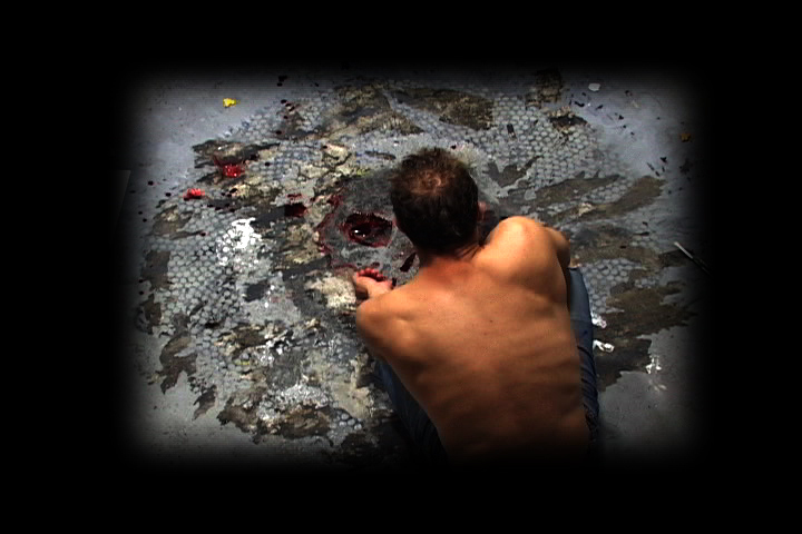 In his untitled (floor carving) video work from 2006, Nathan Danilowicz documents his performative actions using a fixed camera position, engaging the viewer as if she were looking down, from a bird’s eye view at the artist as he mysteriously scrapes and carves the concrete floor. Much of the action is hidden beneath the body of the artist– what we can see is the undulating movements of bone and muscle beneath the artist’s skin. The surface of the concrete and the surface of the body– together, in accord with one another, revealing and concealing the artist’s ritual that culminates with drips of his blood sprent onto the textured floor. The video is a truncated document of a longer performance and is accompanied by a sound clip featuring Marlon Brando’s character, Colonel Kurtz, from Apocalypse Now. The audio underscores the visual atmosphere and questions Danilowicz aims to put forth– that of morality in the face of horror, servitude, love, and sacrifice. The viewer is witnessing the artist in his studio, losing himself in the rapture of creation and erasure.