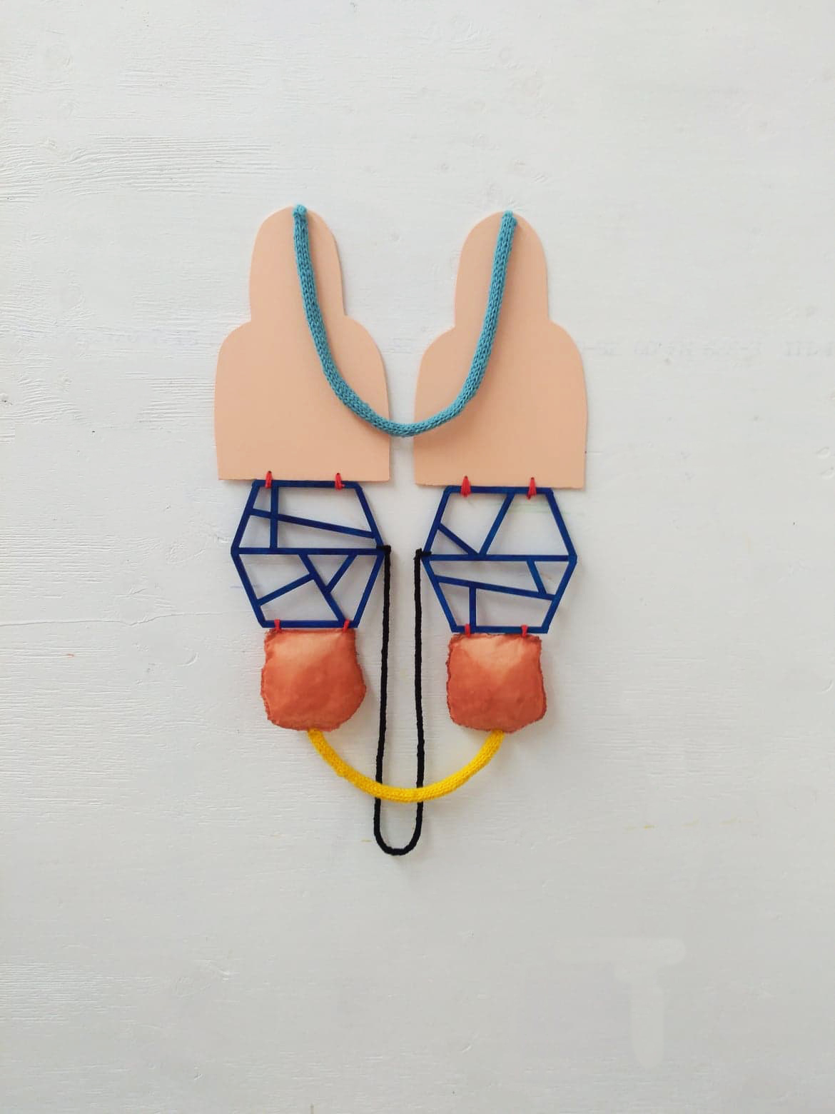 SWIM Gallery presents Naked heart, a solo exhibition by Marie J. Engelsvold. This exhibition features large scale sculptures, small and large drawings, attempting to show the artists’s vulnerability and nakedness. The sculptures are fragile constructions, made with wood, yarn, textiles and foam. Most of the works in the exhibition are symmetric, and reflect the duality of life.